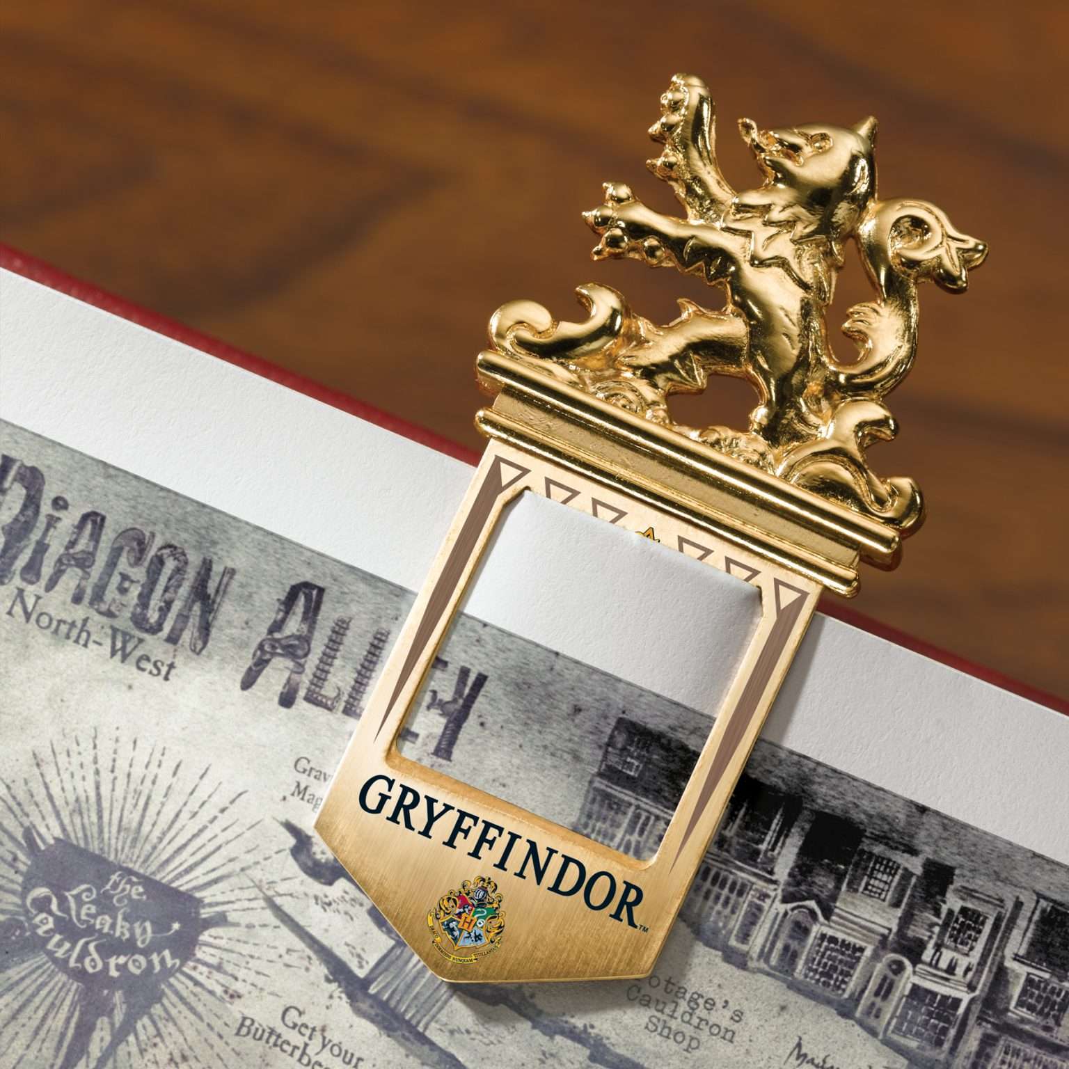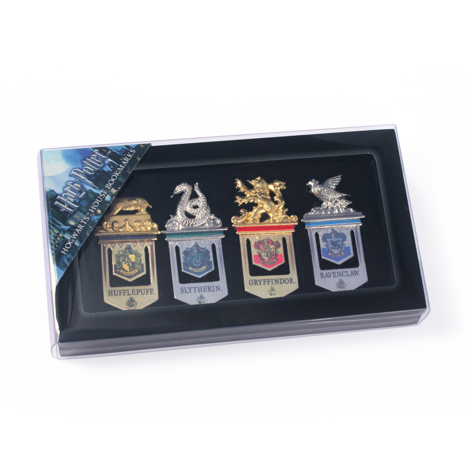Never lose your reading place with this set of silver and 24K gold plated Harry Potter Hogwarts bookmarks in a black display case.