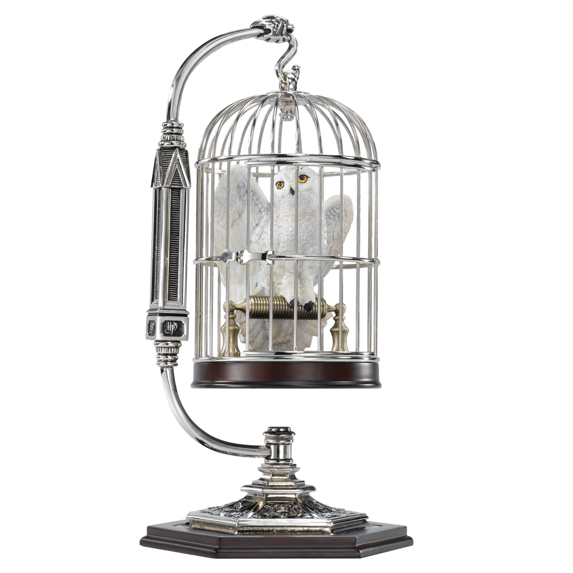 This stunningly detailed miniature recreation of Hedwig in her cage features an arched pedestal display to hang the cage.