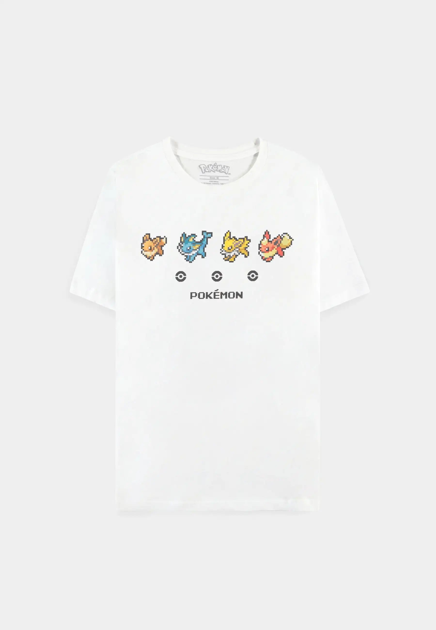 Officially licensed Pokémon merch available for wholesale across the EU and UK, this Eeveelutions t-shirt taps into nostalgia with a playful pixelated design. The clean white cotton base highlights Eevee alongside its most beloved evolutions — Vaporeon, Jolteon, and Flareon — with a CMYK-printed finish that mirrors classic 8-bit game graphics.