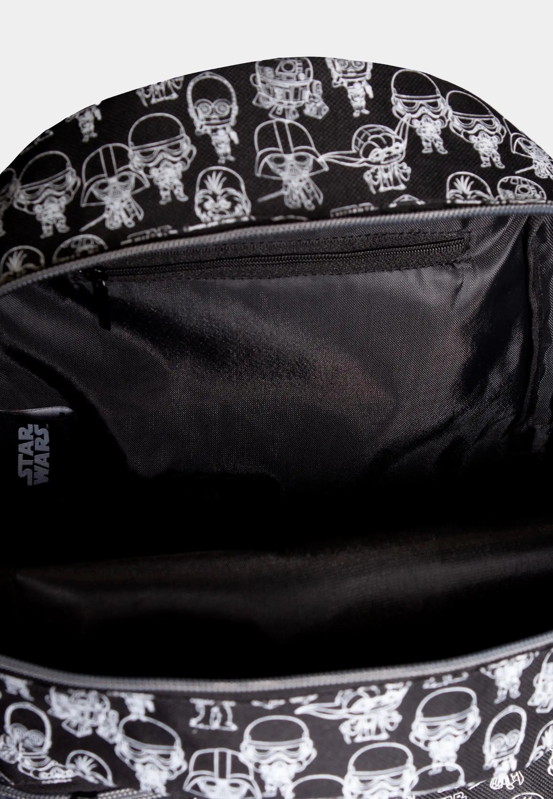 Be as fearless as the stormtroopers with this cool black mini backpack. The whole front and back feature a cool all-over print of the most iconic Star Wars villains. The backpack has two side open pockets, a front pocket, and a main compartment with a hidden pocket. All the outer zipper pullers have Star Wars logos on them.