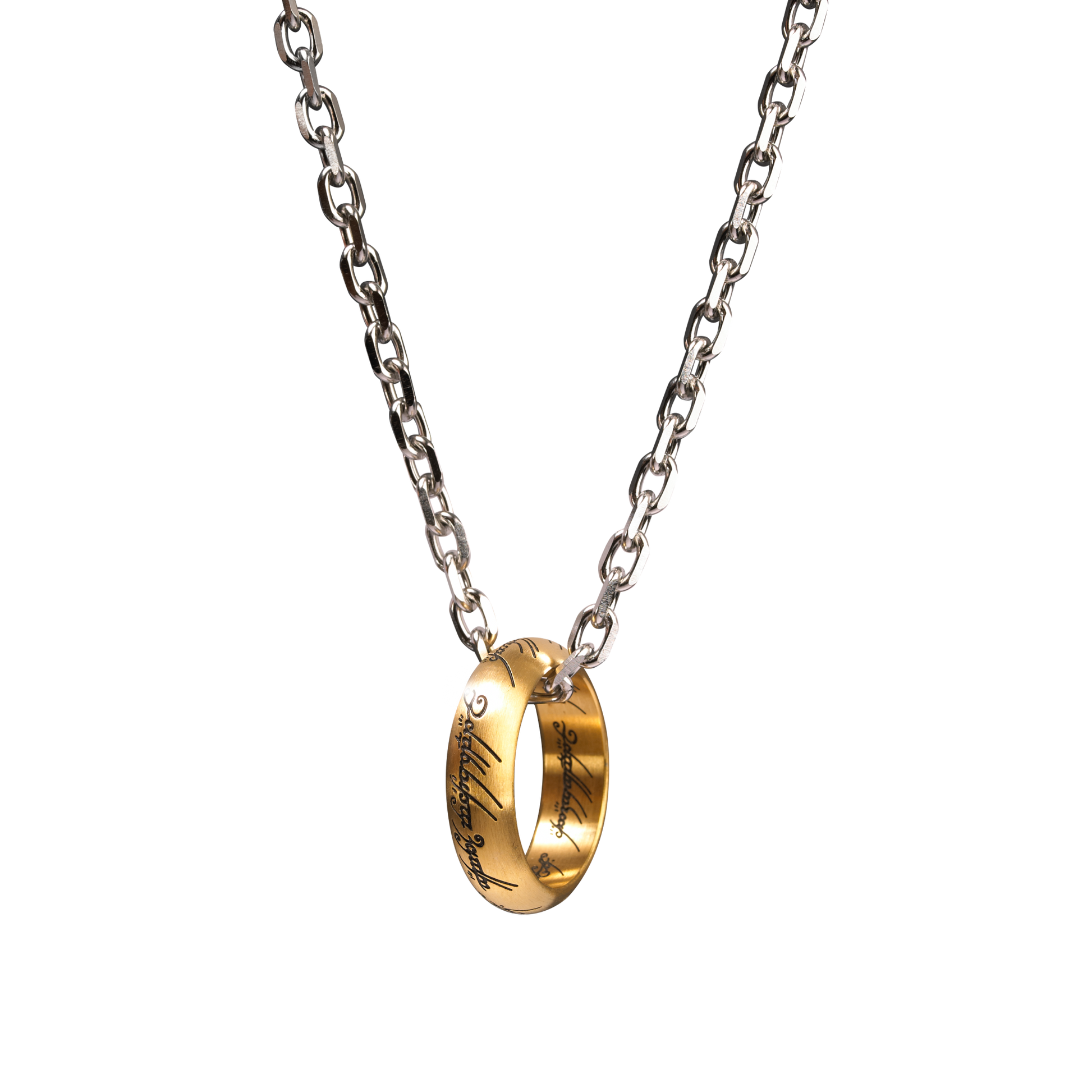 An anodised stainless steel One Ring on a chain, perfect for hiding under clothes to keep away from the prying Eye of Sauron. Each ring features a laser etched inscription of the One Ring verse.