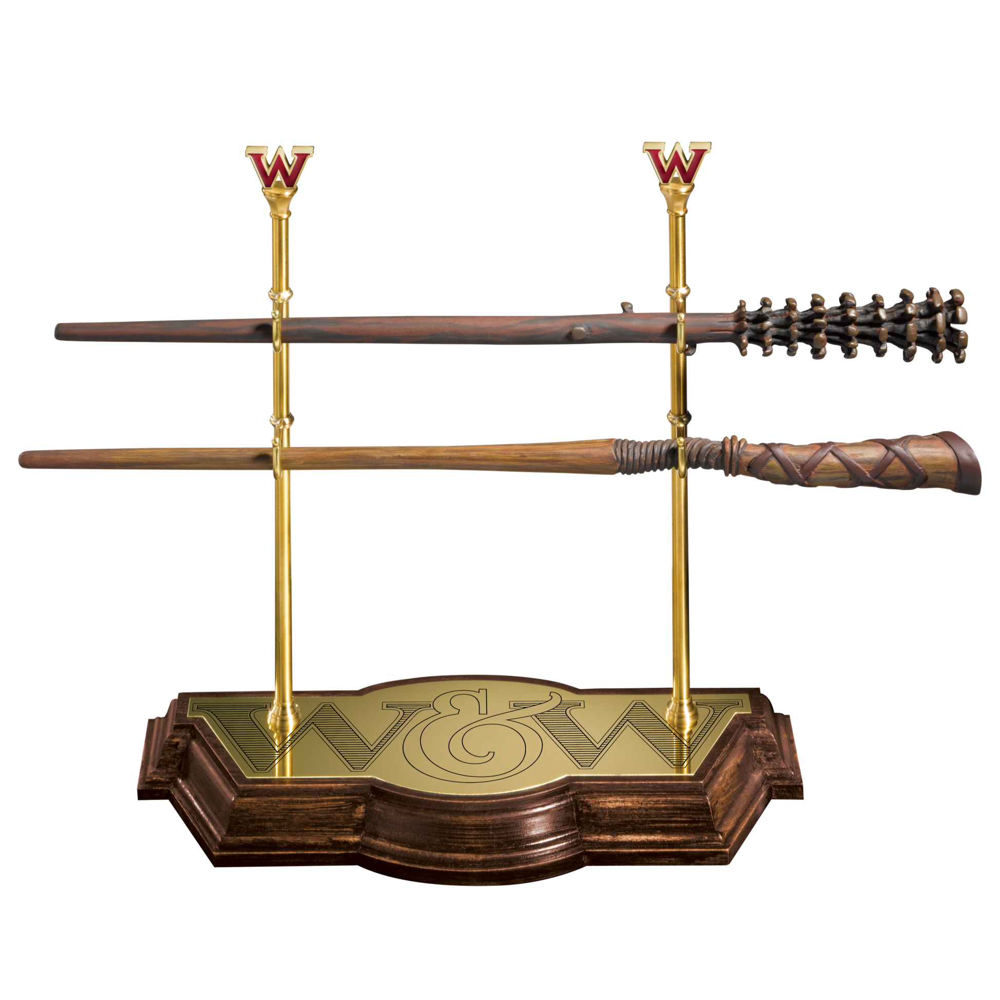 The wands of the Weasley twins, Fred and George, on an elegant die cast metal and wood display stand.